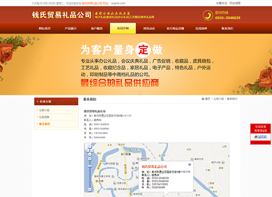 錢(qián)氏貿易位于歷史文化古城安徽省滁州市。是一家專(zhuān)業(yè)從事辦公禮品,會(huì )議慶典禮品,廣告促銷(xiāo),收藏品,皮具箱包,工藝禮品,收藏紀念品,家居禮品,電子產(chǎn)品,特色禮品,戶(hù)外運動(dòng),印刷制品等中高檔禮品的公司。