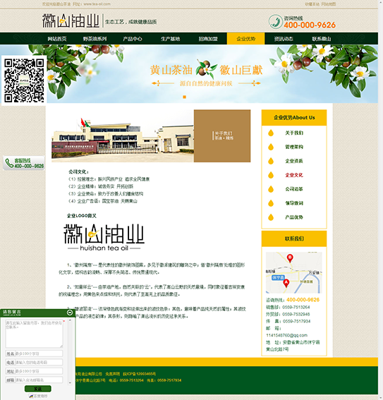 黃山市徽山食用油業(yè)有限公司是一家專(zhuān)業(yè)以油茶系列產(chǎn)品開(kāi)發(fā)為主,集科研、生產(chǎn)加工、貿易為一體的國家經(jīng)濟林產(chǎn)業(yè)化龍頭企業(yè)和安徽省林業(yè)產(chǎn)業(yè)化龍頭企業(yè)。