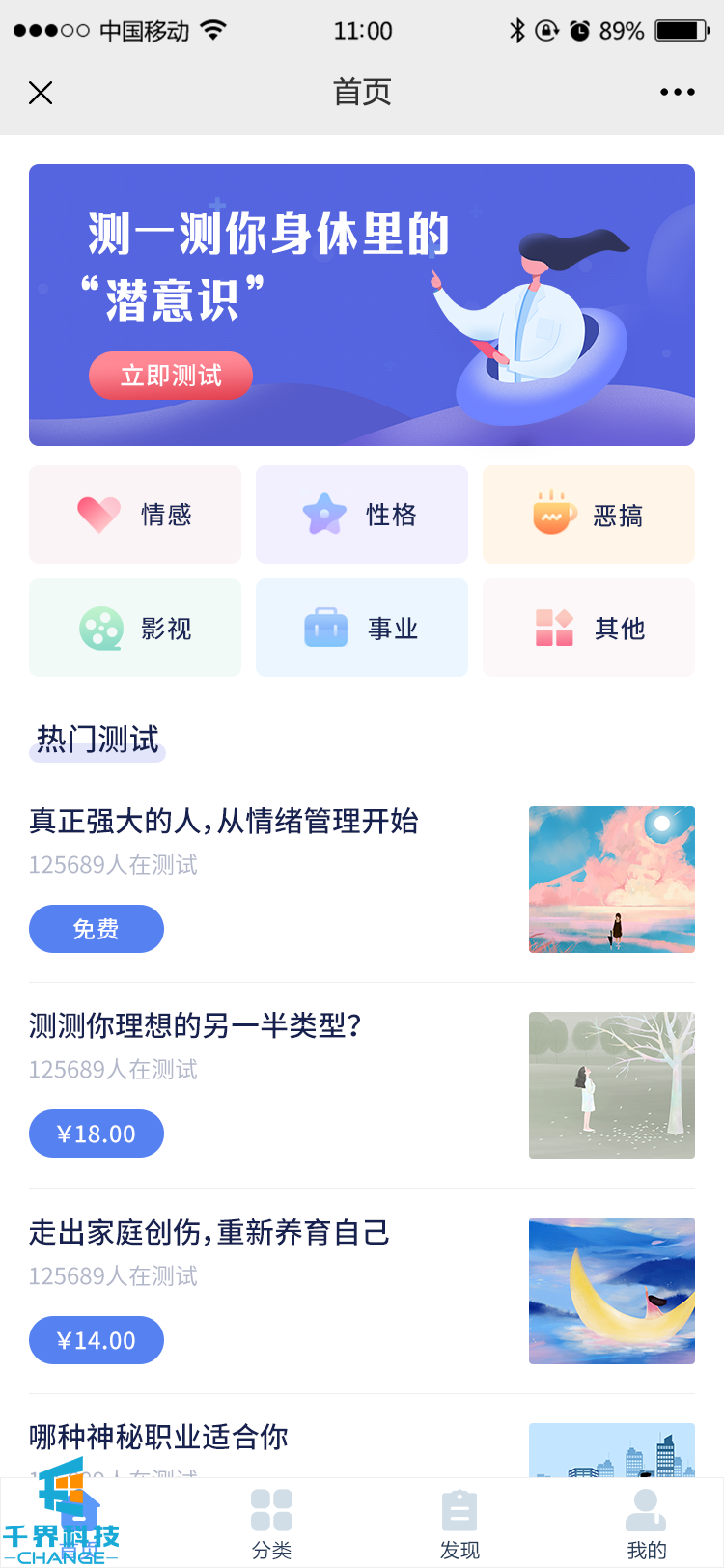 該項目是一個(gè)人身問(wèn)題測試,人身問(wèn)題分析,通過(guò)答題的形式,系統根據答題結果匹配對應的分析結果。項目主要分為熱門(mén)項目測試,所有項目分類(lèi),資訊版塊,個(gè)人信息以及測試結果。