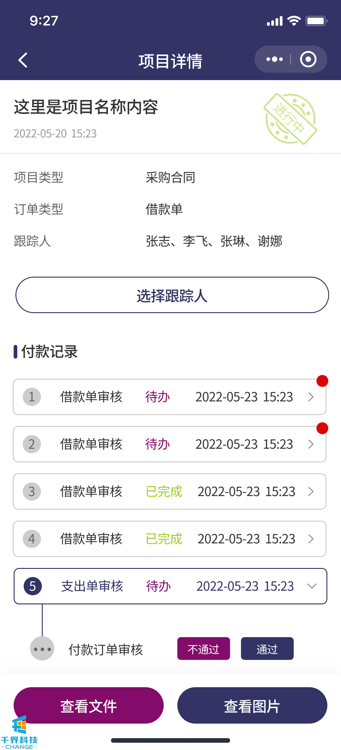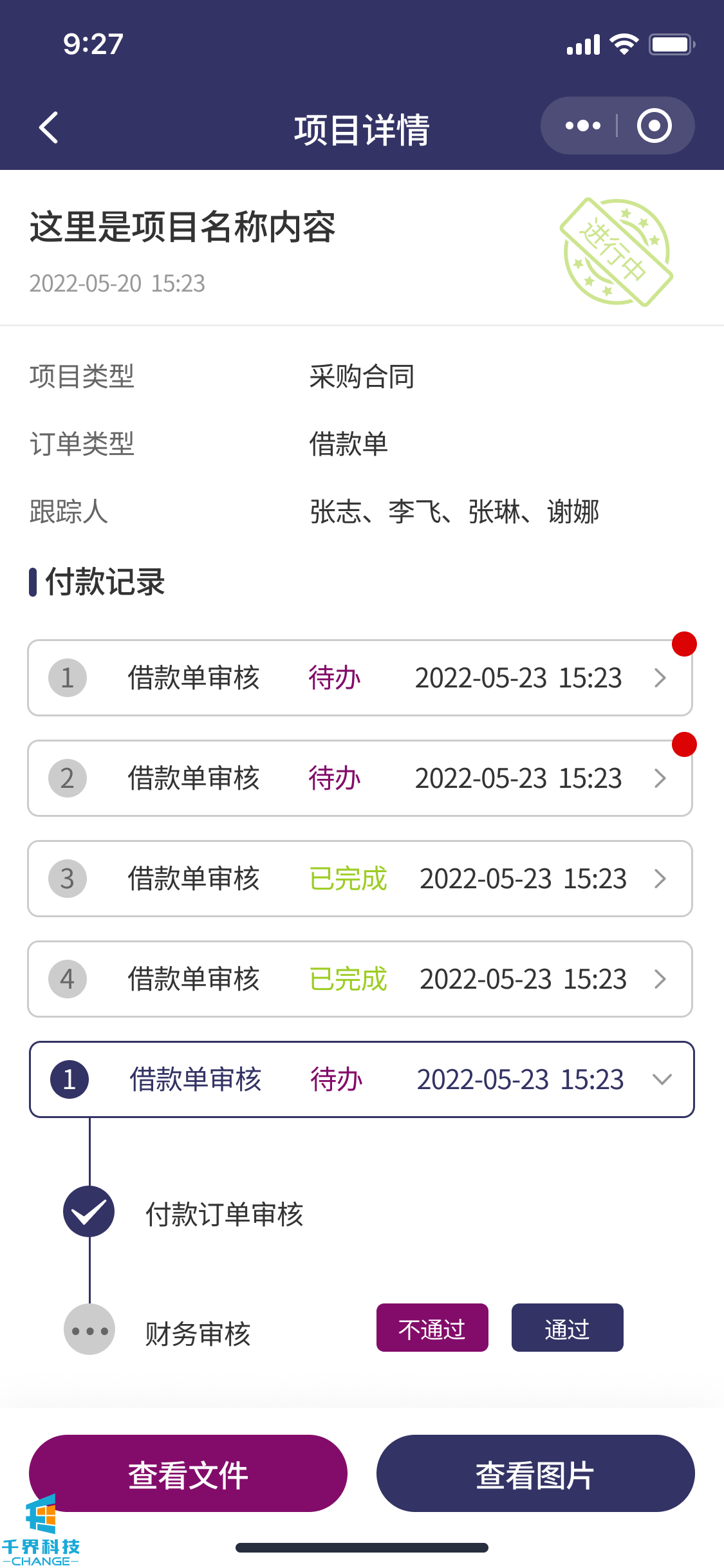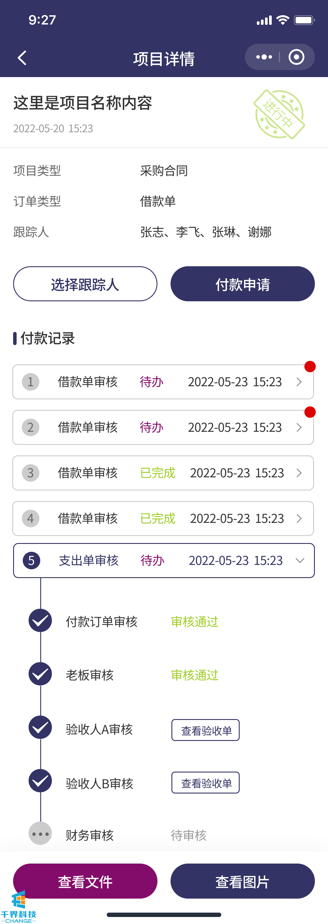 該項目是一個(gè)解決企業(yè)內部付款審批流程的線(xiàn)上程序。包含了負責人,法務(wù),領(lǐng)導,驗收人員,財務(wù),出納。根據設定的流程依次審批??梢詫?shí)現多合同,多次付款審批,每次付款記錄多角色審核明細等