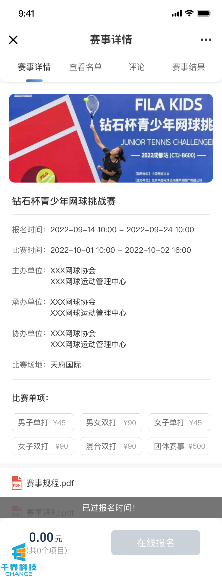 客戶(hù)做一個(gè)網(wǎng)球賽事報名的模塊,用戶(hù)線(xiàn)上可以選擇報名參加的網(wǎng)球賽事、項目,填寫(xiě)相關(guān)信息,下載比賽資料,查看比賽結果等功能